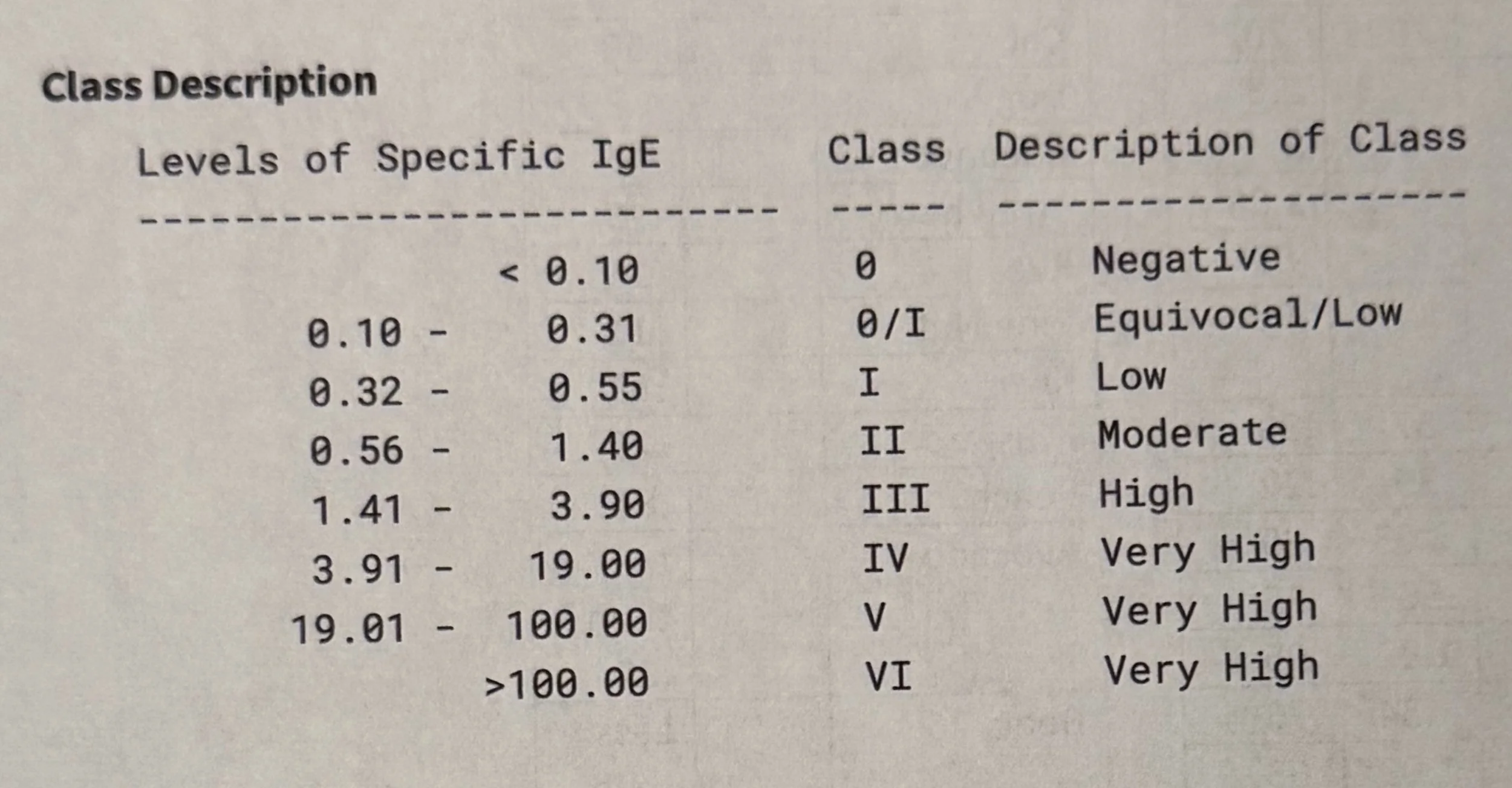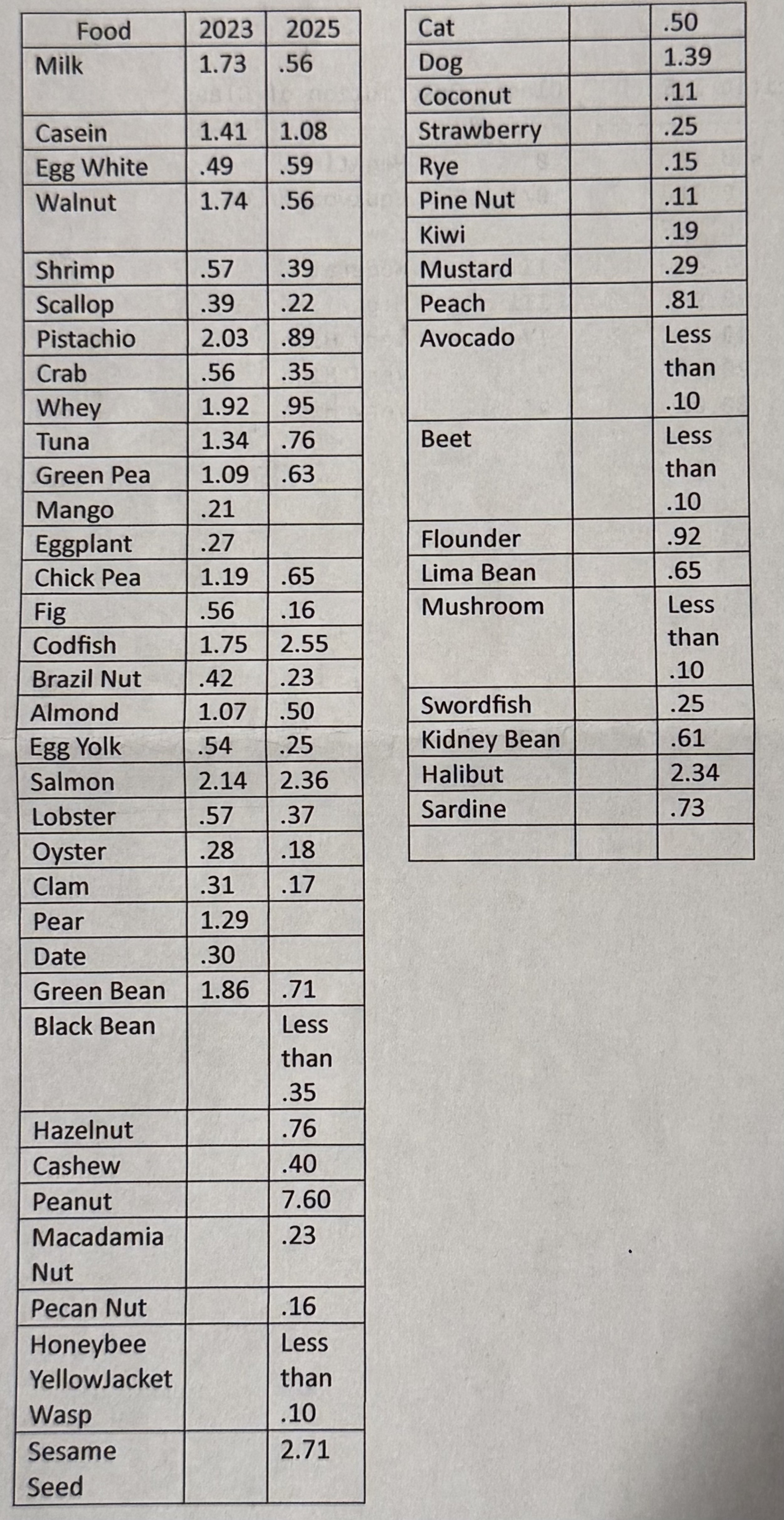 Lab results from Marcello E. after being treated with The Allergy Relief Technique. Note the dramatic improvement in IgE levels to milk, walnuts and pistachios.