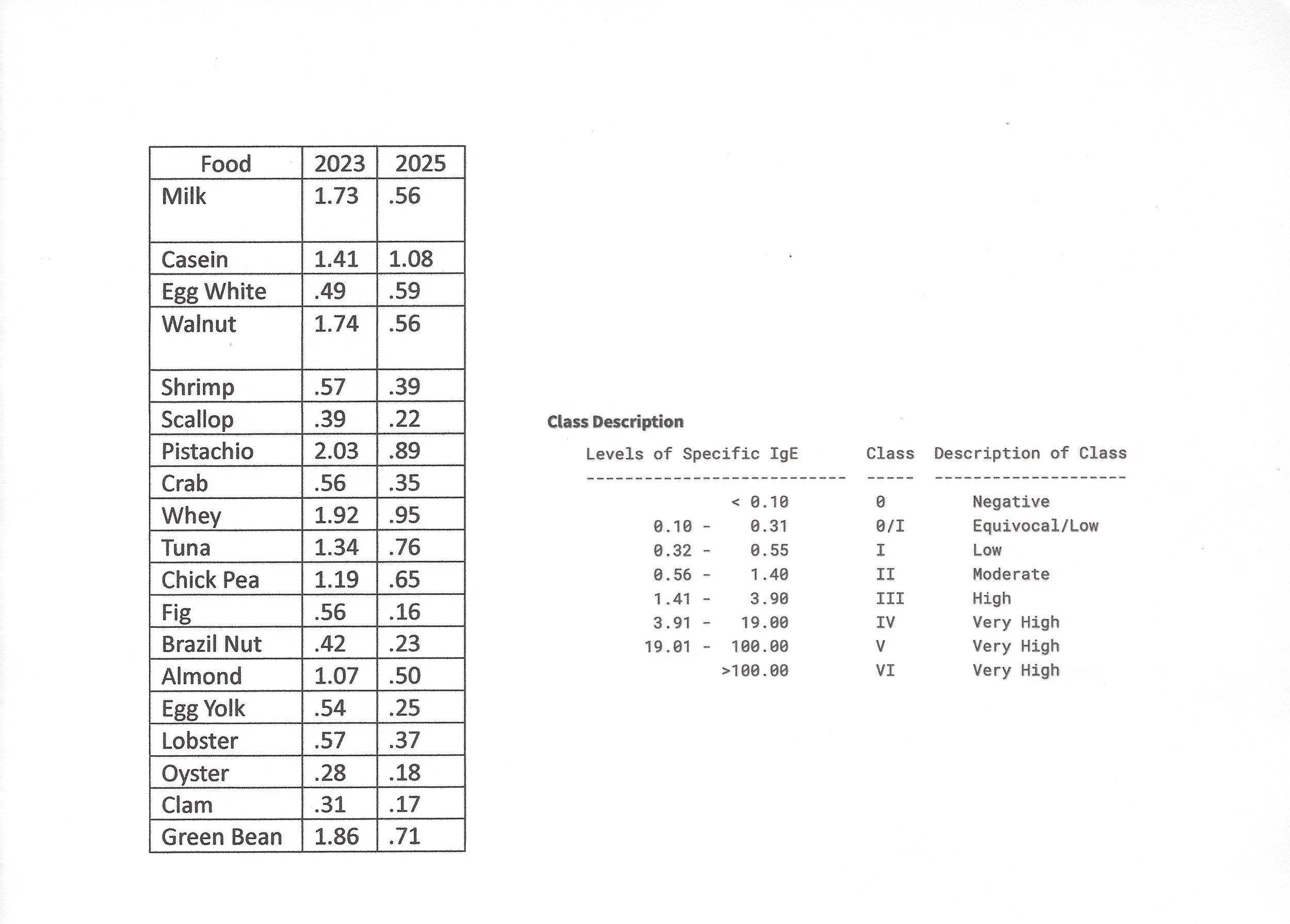 Lab results from Marcello E. after being treated with The Allergy Relief Technique. Note the improvement in IgE levels to every food except egg whites—which he was not treated for.